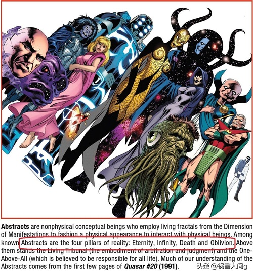 抽象实体都是宇宙规则的化身,而且抽象实体是有层级的,最高级别就是生命法庭,其下是永恒、无限、死亡和湮灭。永恒、无限、死亡和湮灭是除了生命法庭外最强大的抽象实体,被称为“宇宙罗盘的四个点”,是“现实的四个支柱”。