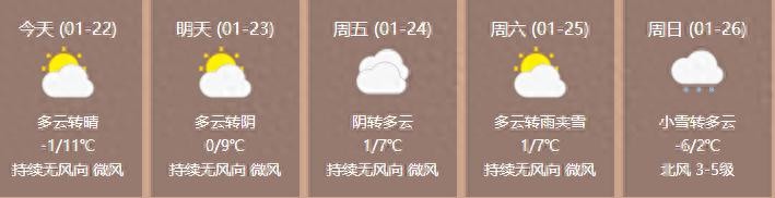 今天下午到明天白天多云转晴,明晨有雾或轻雾,北风2~3级,明晨最低气温济阳区、莱芜区、钢城区、商河县、南山区、起步区-5℃左右,市区及其它区县-1℃左右,明天最高气温9℃左右。