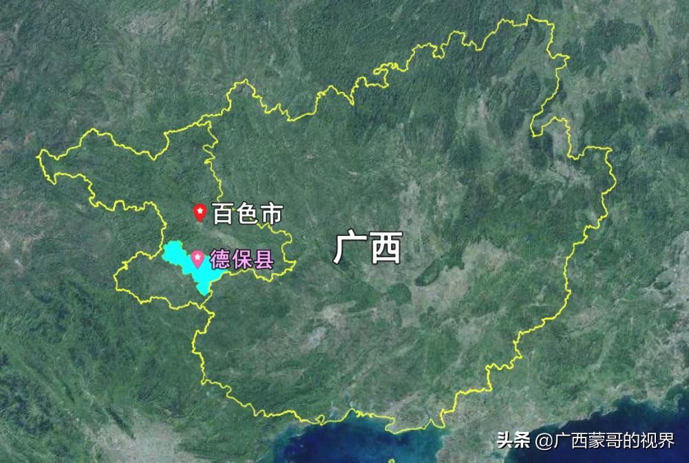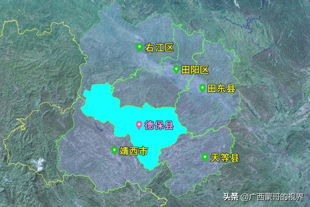 德保的周边是靖西市、天等县、田东县以及百色田阳区和右江区,从地图上看,德保离广西的边境非常近,直线距离也就几公里,被靖西市和右江区给挡住了,不知道为什么要这么划分。