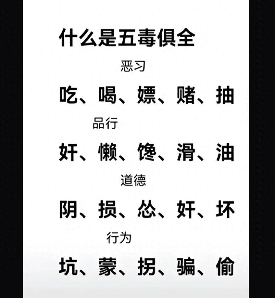 其实,人无完人,谁都可能有缺点,但要是真“五毒俱全”,那可就太糟糕了。不过,人是会变的,就算有这些问题,只要真心想改,从点滴做起,去克服恶习,修正品行,提升道德,规范行为,还是有机会走上正轨的。毕竟,浪子回头金不换呀,大家觉得呢 ?