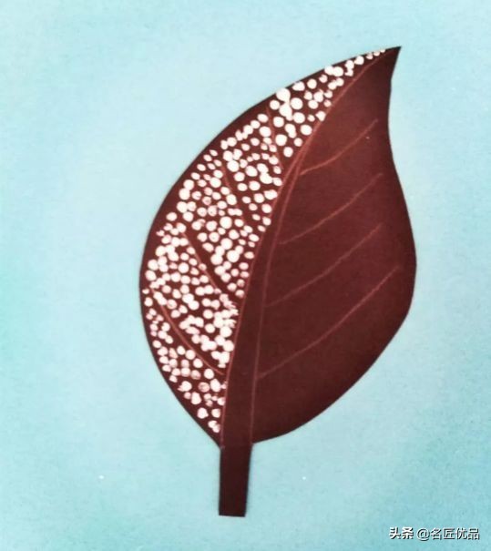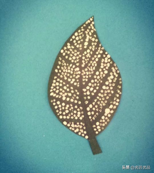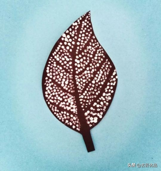 用牙签平的那头沾着颜料在树叶上点小点,脉络的地方要留白哦。