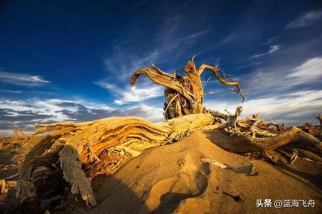 胡杨林的传说。胡杨,是世界上最古老的杨树品种,有着顽强的生命力,有“活着一千年不死,死后一千年不倒,倒后一千年不烂”之说。胡杨林国家级自然保护区位于额济纳旗中心位置—额济纳绿洲,总面积26253公顷,属野生植物类型自然保护区。数百年的胡杨林在此枝繁叶茂,领尽大漠瀚海风骚。在原始胡杨林东南部景区,有三株胡杨残骸。其中一株倒卧的残木,其形态酷似一匹四蹄陷入沙土、正在昂首长嘶拼力挣扎的骏马。不远处有一株直立的胡杨,远远看去,就好像一尊双手合十的得道高僧。在其南侧大约数十米的地方,恰好又有一株形似猴子腾挪跳跃的胡杨树。另有一处景观同样颇耐人寻味。在两棵老态龙钟枝叶婆娑的胡杨树怀抱里,偎依着一株铁骨铮铮了无生机的胡杨残骸。三棵胡杨生死相依、傲然挺立于千年荒漠中,其悲壮之态令人唏嘘不已。