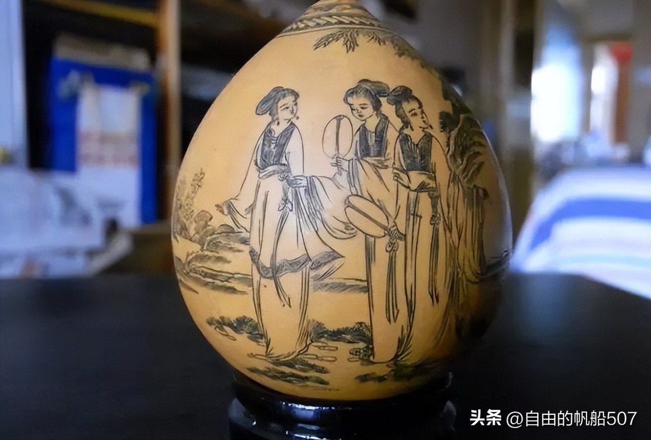远在明清时期,民间在喜庆婚娶、祝福庆寿、喜得贵子时,为图吉祥如意,就有了赠送红鸡蛋的习俗。当时在京城一带更是流行此风,而且用量也相当可观。于是就有一部分人摆摊设铺,专门卖红色染过的鸡蛋,称其为'彩蛋'。后来,商贩们又在彩蛋上画些花鸟、鱼虫、脸谱等图案,以图生意兴隆。经过多年演变,彩蛋工艺逐步提高,最后,终于形成了具有较高欣赏价值的蛋雕艺术品。