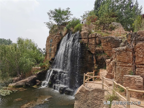 在南门口验票之后,门口处有三羊开泰的雕像,沿景区步道,到兵神桥处,站在桥中位置,观一方很有意境的人工瀑布,非常的漂亮,过桥之后,这里是整个羊山景区,以地质地貌为景观的主景点,看一看壮观的山水石林景观,这边有三生石,曹公亭等一些景点