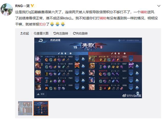 另一种行为倒不会导致封号,只是容易参加不了排位和巅峰赛,那就是连败。相信小伙伴们都有感觉,这个赛季的扣分机制虽然没有那么严格,但辅助位置还是容易被举报故意送人头。RNG的辅助就曾经因为这个举报机制发微博抱怨辅助很难办,天崩局死的次数多能怎么办呢?