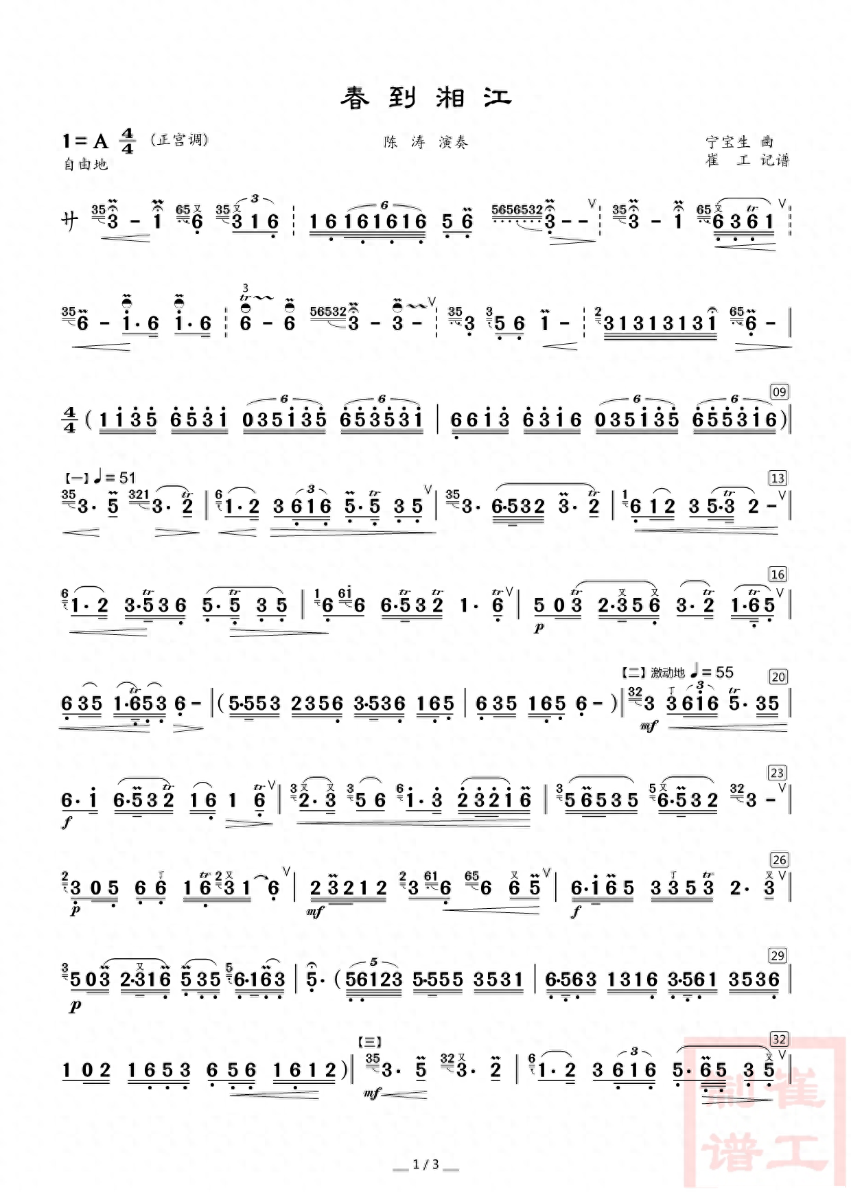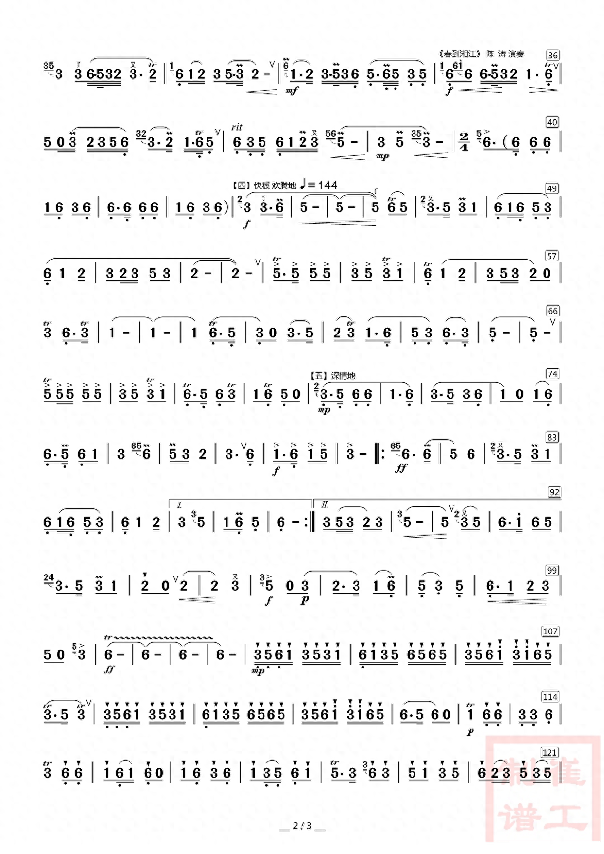 《春到湘江》湖南特色浓郁。乐曲表现湘江两岸秀美的春光和人们欢欣鼓舞、建设家园的豪情壮志。因子,广阔而富于激情,展现出湘江碧波滚滚、烟雾缭绕的壮美景色。如歌的行板那轻盈的旋律,时而吟唱般低回,时而激扬高歌,甚为柔美动人;中段由羽调式转同宫徵调式,意境清新。本曲为唐骏乔演奏,婉转悠扬,非常好听。