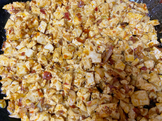 都知道麻婆豆腐是一道可口的下饭菜,其实它也可以当成包子馅,味道同样鲜香美味,起锅烧油,倒入两大勺豆瓣酱,用小火炒出红油,再倒入葱姜蒜爆出香味,调味放生抽,花椒粉、辣椒面和少量白糖,接着倒入豆腐,翻拌均匀,就可以关火了,