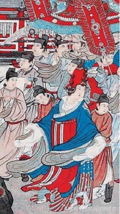 历史上还有几幅画,人们推测里面有武则天,但是都缺乏过硬的证据。比如,《唐后行从图》被认为是唐代著名大画家张萱的作品。张萱与武则天基本同时代,这如果真是他创作的,那图中“唐后”是武则天的可能性就很大了。由于原画已经比较模糊了,可以看一下今人临摹的《唐后行从图》:这幅临摹的画里“皇后”的形象比较清晰,的确符合史书中记载的武则天的体态特征,所以有现代学者据此认为这幅画像就是描绘武则天的。可是问题在于,这幅画是不是唐代的还有疑问。有人根据其中出现的太湖石以及竹子的画法,认为恐怕是宋以后的作品,而且这幅画也没有题记文字,所以很难断定画的就是武则天。