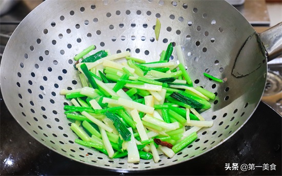 5.锅内烧油放入葱姜蒜、几粒干辣椒和花椒,小火炒香以后放入蒜苗梗和芹菜段翻炒几下,再倒入玉兰片,加入少许食盐码底味,炒至七八成熟即可盛出来垫底,炒太久的话后期吃的时候就不脆了。