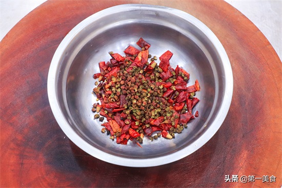 3.准备一个小碗,放入一把干辣椒,喜欢辣一点的可以放一些七星椒,一小把青花椒,一小撮花椒,其中辣椒和花椒的比列为5:2。
