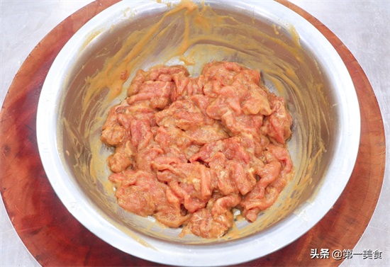 打入一个蛋清,抓拌至蛋清被全部吸收,打出牛肉的胶质,放入少许淀粉锁住里面的水分,淋入一点植物油拌匀以免牛肉粘连,然后放在一边腌制15分钟。