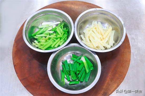 2.小香芹洗干净切成段,蒜苗轻轻拍散斜刀切成段,把蒜苗梗和叶分开,玉兰片切成长条,配菜的种类不固定容易熟的素菜都可以。