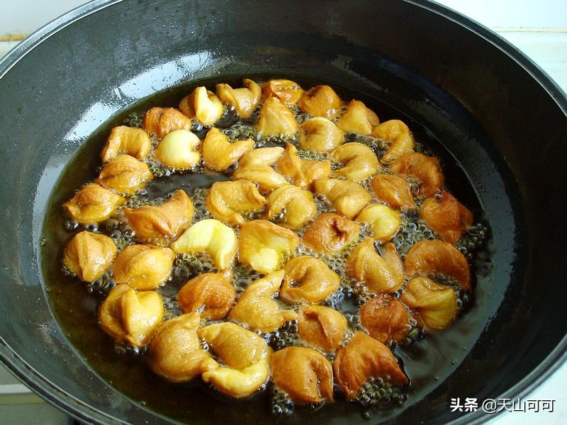 炸面食,最好用茶籽油炸,这是最香浓炸面食的好植物油,这是我们这里每天吃的家常炒菜油。因此,只要我做炸小零食,就必须用茶籽油,这是别的植物油无法代替的香味。这道炸面果子可以随时炸,只要和好面团,不用醒面也不用发面,稍微多揉揉把面团揉成光滑的面团即可,做成漂亮的形状,这个形状可以自己创意,也可以做成面果子固定的形状。只是家里要有孩子吃的,可以做得更小一些,这样可以一口一个,吃起来很方便,又酥又甜真好吃。