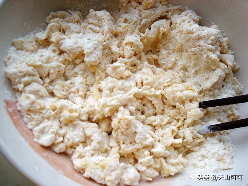 2、加少许清水搅拌成面絮,揉成光滑面团。没有时间的话,可以不用醒面发酵。
