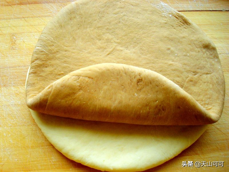 6、把白面团先擀成薄片,再把红糖面团放在上面。就像包包子一样,把红糖面团包起来,把褶子一边朝下面,用擀面杖擀成大圆片。也可以把白面团先擀成薄片,再把红糖面团擀成薄片,铺在白面片上,一起擀出来。