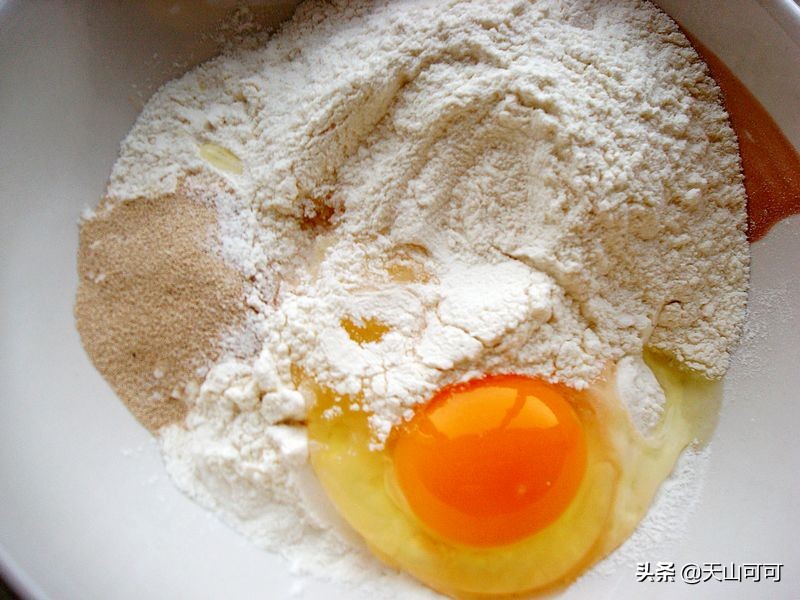 做法:1、把300克面粉里,加一个鸡蛋,加30克植物油、2克酵母粉、加60克白糖搅拌均匀