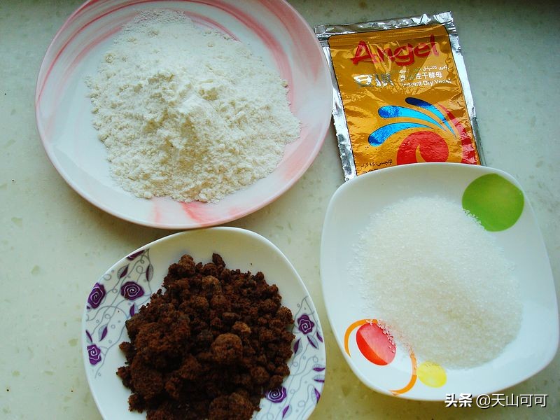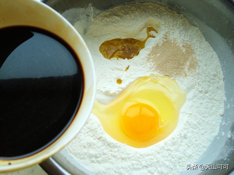 3、另一个大盆里,把300克面粉里,加一个鸡蛋,加30克植物油、2克酵母粉,把红糖融化成红糖水,这样好和成面团。