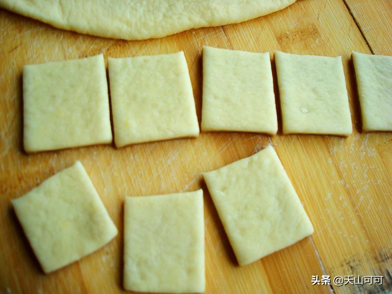 7、用刀切长条(大约3厘米宽),再切成四方形的块,大小要一样啊,这样炸成糖果子好看。