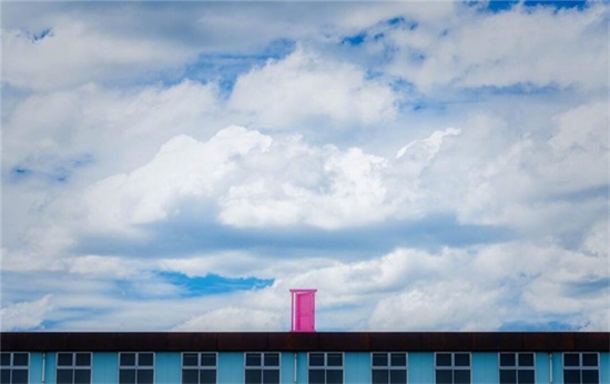 这样看粉色的任意门真的很显眼!和这个门窗工厂的绿色建筑一起很有视觉冲击力