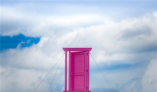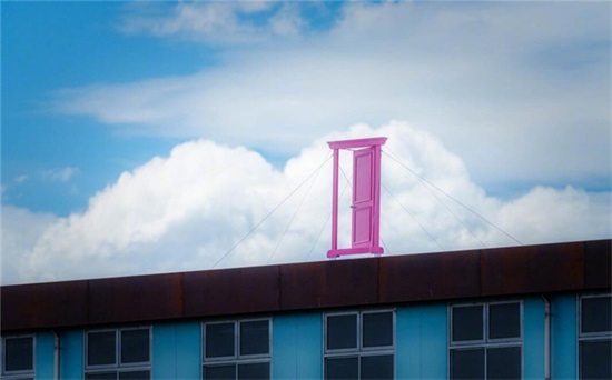 熟悉的粉色任意门,被放置在了房顶上,蓝天白云的背景