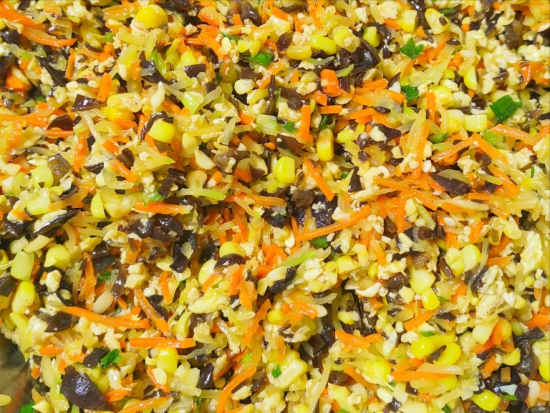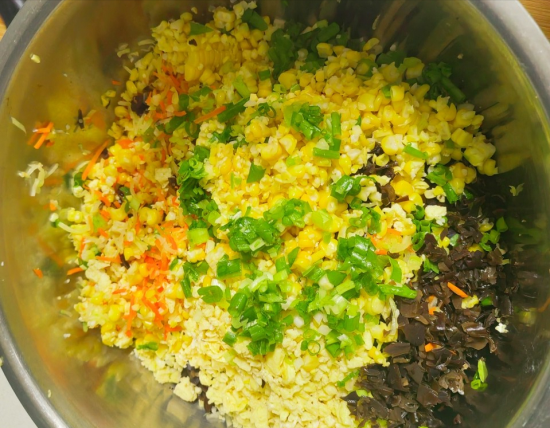 把攥干的萝卜丝装入盆中,加入黑木耳、鸡蛋、玉米粒、葱花,把这几种材料混合到一起,用筷子搅拌均匀。