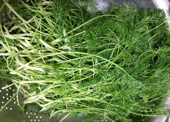 准备一把新鲜的茴香苗,用清水淘洗干净,尽量多冲洗几遍,洗掉多余的泥沙,放在通风处晾干,控干切成碎馅。