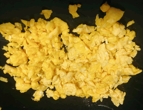 碗中打入3个鸡蛋,充分搅拌均匀,起锅烧油,油热倒入鸡蛋液,用中小火加热,待到即将成型的时候,快速滑铲搅拌,煎成鸡蛋碎,炒好后出锅备用,晾一晾。
