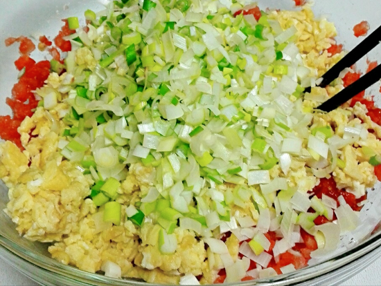 把鸡蛋下锅煎一煎,煎成鸡蛋碎捞出,晾凉以后,再倒入西红柿中,加入适量的葱花,增加一下葱香味,翻拌均匀。