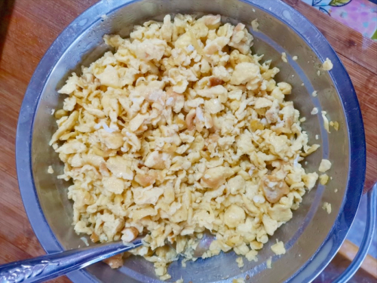 碗中打入4个鸡蛋,充分搅拌均匀,起锅烧油,油热倒入鸡蛋液,用中小火加热,煎成鸡蛋碎,关火出锅,放凉备用。
