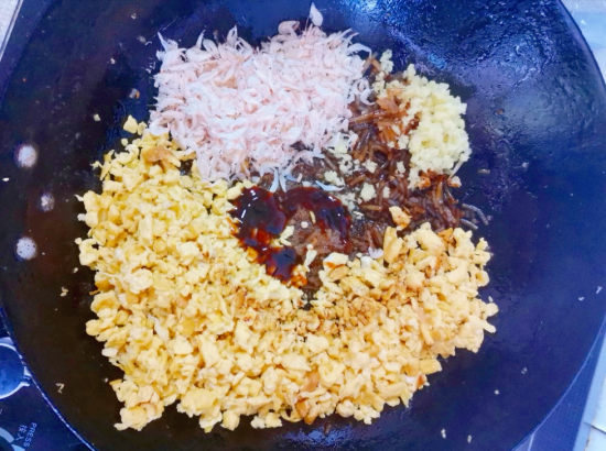 一小把粉条,提前泡软泡胀,改刀切成小段,先用热油炒一炒,等放凉以后,再倒入鸡蛋碎和虾皮,按照个人的口味,加入蚝油、十三香、食盐,搅拌均匀。