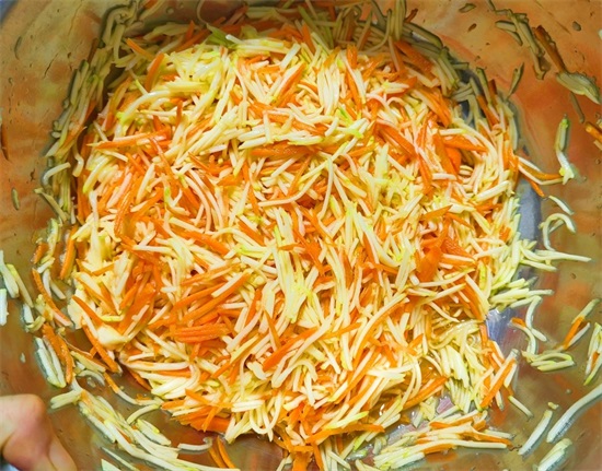 准备2个胡萝卜,1个西葫芦,清洗干净,用擦丝器擦成细丝,放入盆中,舀入一勺食盐,翻拌均匀,腌制半个小时,逼出内部的水分,等时间到了,用滤布包裹起来,攥一攥多余的水分。