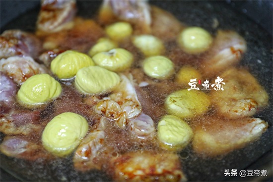 4、这个时候倒入准备好的肉片进行翻炒,大致翻炒几下后加入大量的水。接着加入所需要的调味料、香料,并倒入之前准备好的板栗仁。