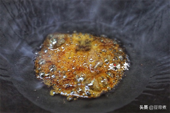3、锅热适量的油,待油温升高至六成热之后放入一把老冰糖。边加热边搅动,直至呈现褐红色的状态。