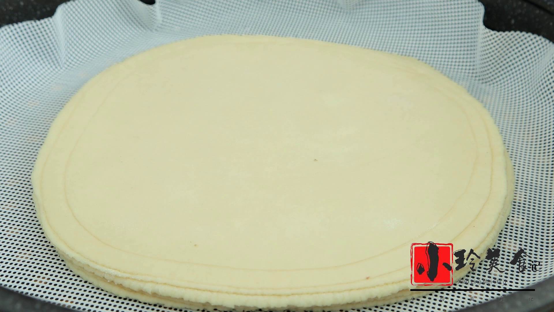 4:面剂擀好后放入蒸锅中,盖上盖子开水上锅蒸,蒸15分钟左右即可,蒸好了打开盖子,表面起了大气泡,稍微晾一下就可以吃了,如果要求更好看一些的话上面可以扣上一个大点的盘子,用刀把边缘切掉,把多余的面撕下来,再趁热把春饼一张一张地揭开,我们的春饼就完成了,卷盒菜卷肉都非常的好吃,皮薄如纸,柔软劲道