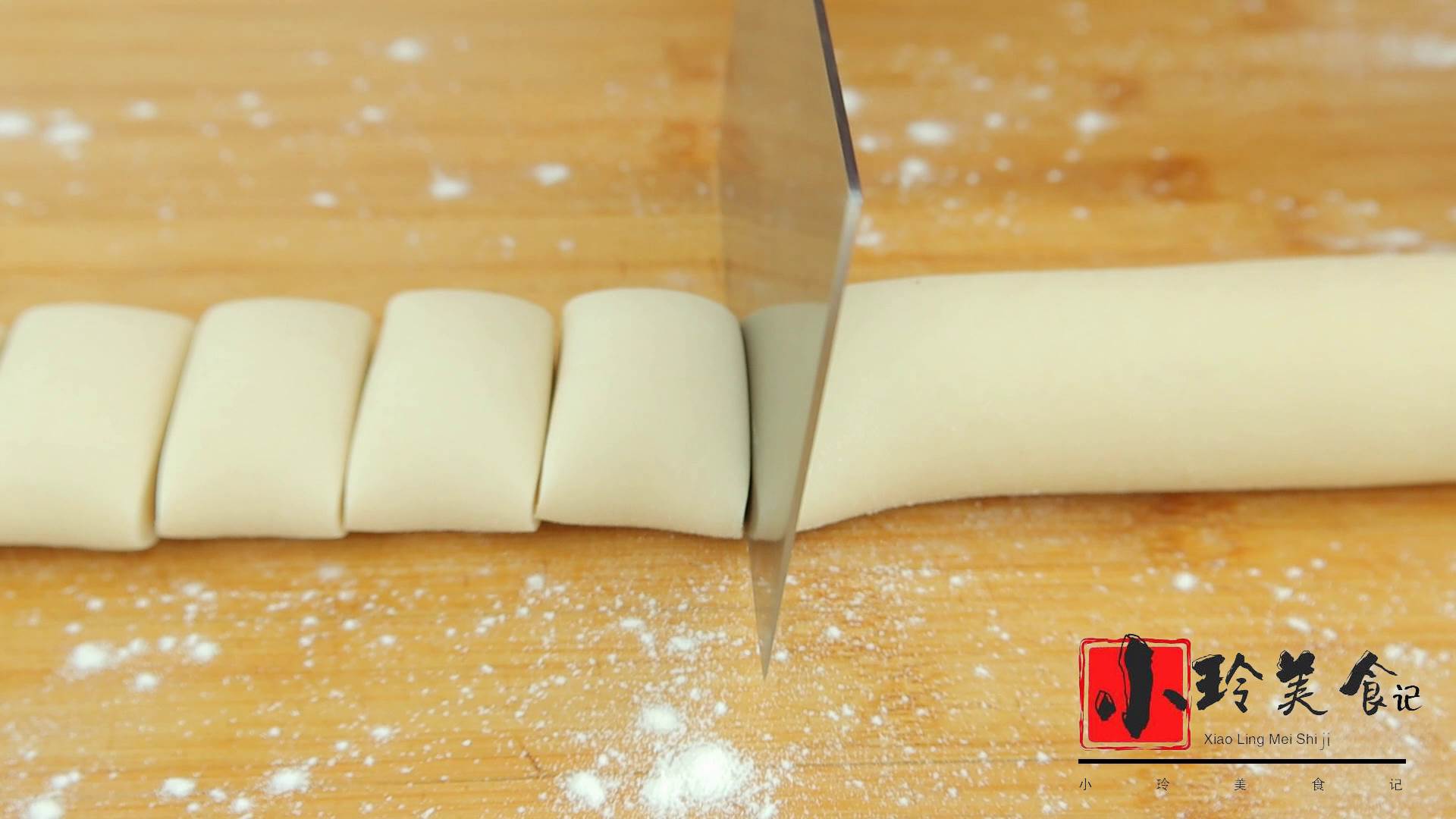 3:面醒好了,面板撒些干面粉,把面团放在面板上分成两份,然后我们取一块面剂搓成长条状,用刀切成比包子的面剂大一些就行了,把每个面剂用手按扁,用擀面杖擀成饺子皮,饺子皮的表面刷上食用油再撒些干面粉,上面再覆盖上一个饺子皮表面再均匀地刷上食用油多撒点干面粉,上面再覆盖上一张饺子皮,重复这样操作,摞5-10张都可以,再用手按薄按扁,放到面板上,用擀面杖压一压,反正面都要压一下,这样大小薄厚会均匀,把另一个面剂也只这样操作就可以