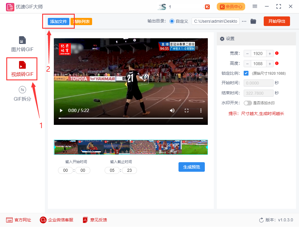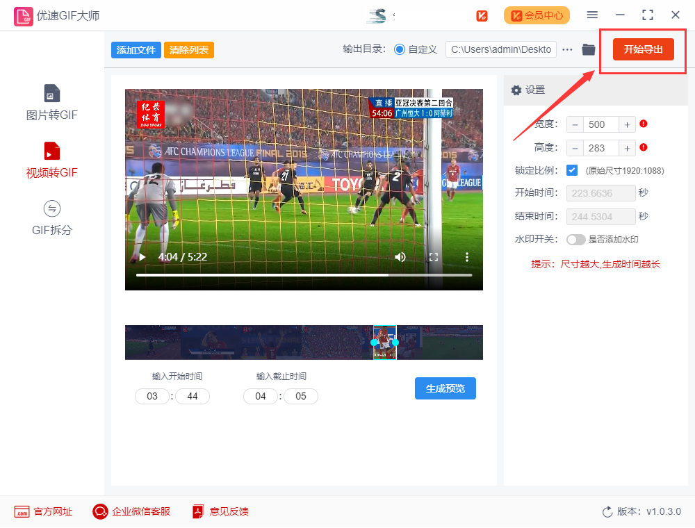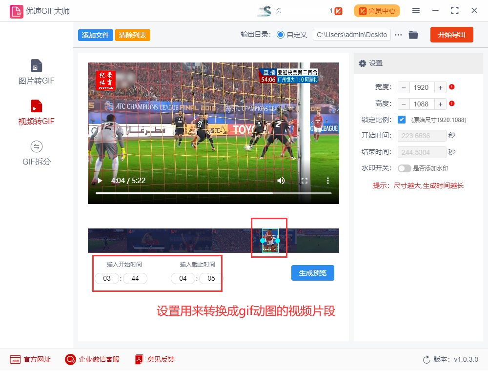 添加好视频后确定需要转换成gif动图的视频片段,我们可以直接输入开始时间和截止时间,还可以用鼠标拖动蓝色圆点来确定时间片段,两个方法结合使用就更简单。