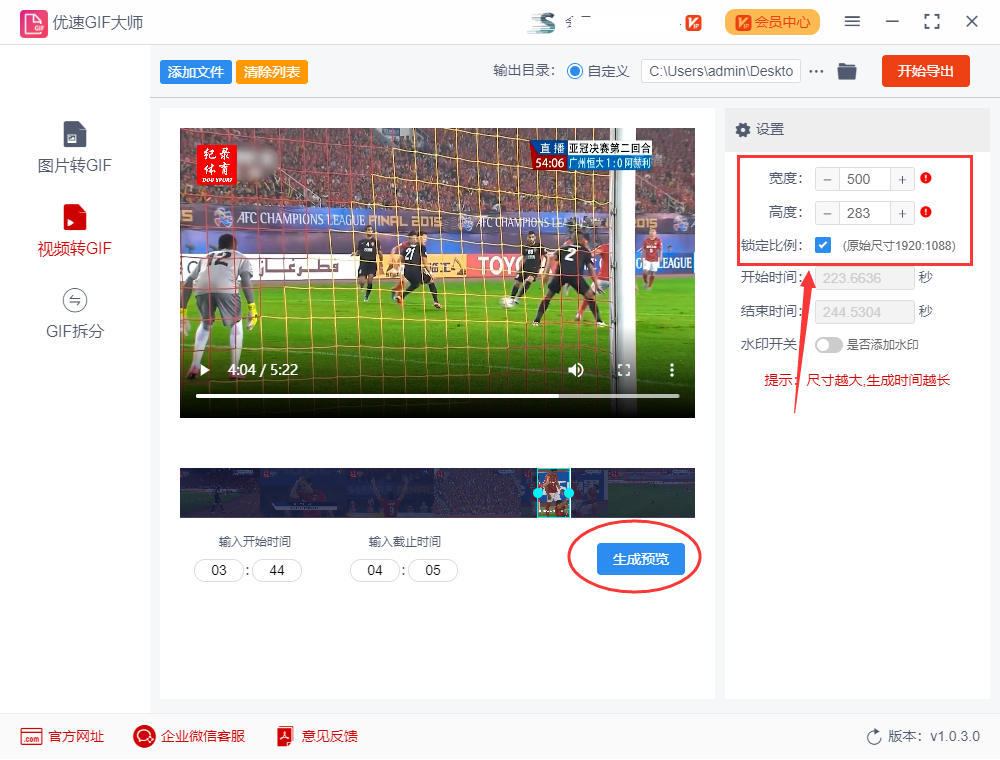 先设置转换完成后gif动图的尺寸大小(宽度和高度);然后点击【生成预览】按钮生成gif预览图,查看gif动图效果是否满意,如果不满意就调整。