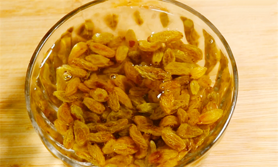 1.首先将准备好的葡萄干300克,放入碗中备用。然后向里面加入适量的清水没过葡萄干。