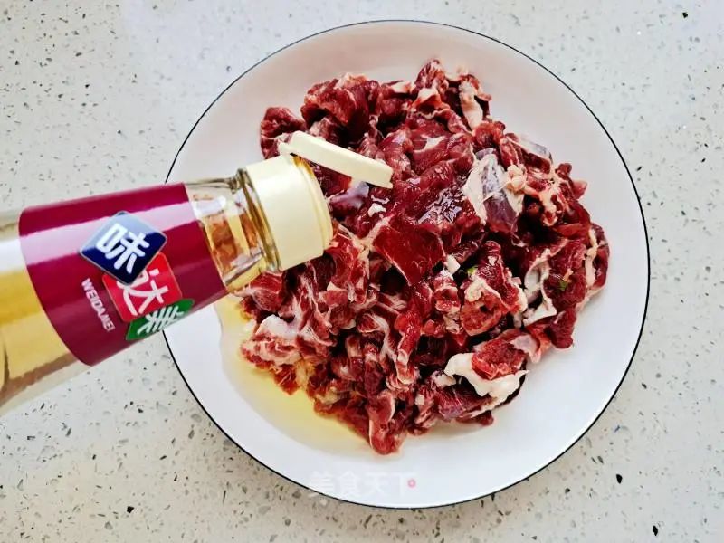 3. 切好的牛肉里倒入料酒。