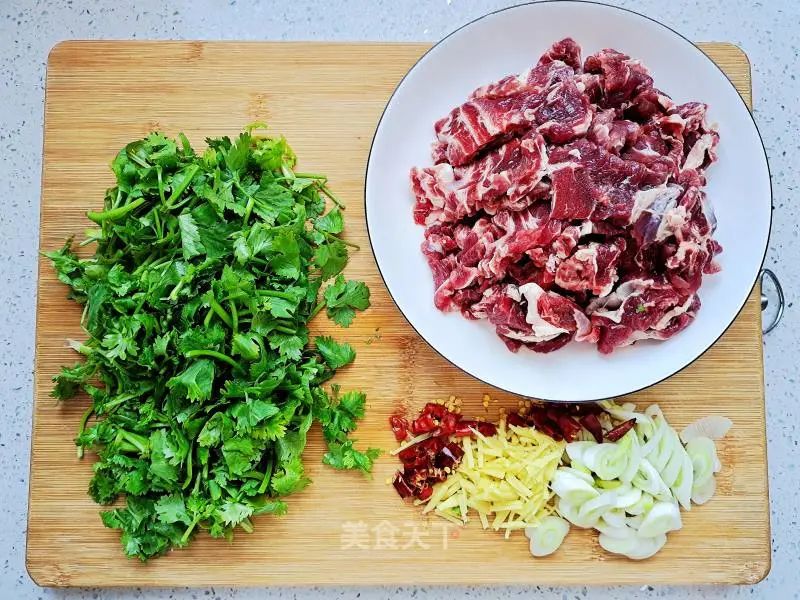 2. 牛肉切片,香菜、辣椒、葱切小段,姜切丝。
