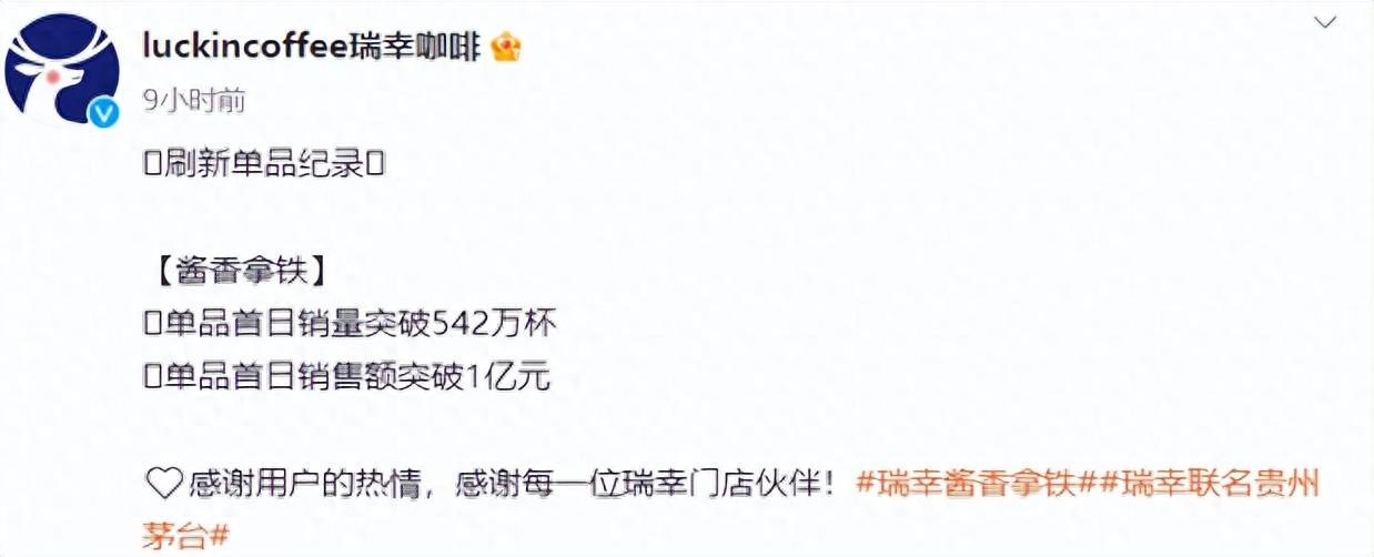 今天,瑞幸咖啡官方微博公布:酱香拿铁单品首日销量突破542万杯,单品首日销售额突破1亿元——远超之前的爆品生酪拿铁131万杯、椰云拿铁66万杯的成绩。