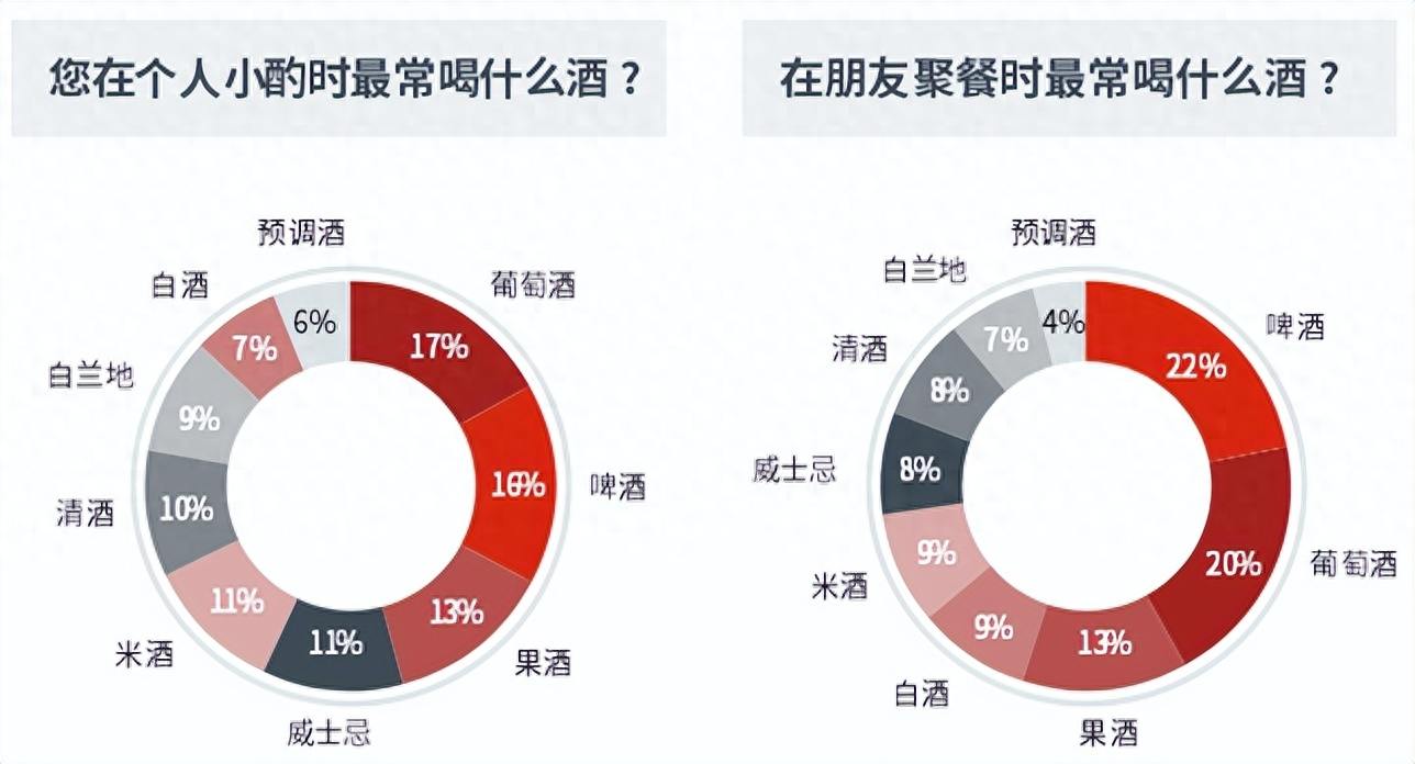 里斯咨询去年底的调研显示,在年轻人个人小酌或朋友聚餐时最常喝的酒中,排名在前的是葡萄酒、啤酒、果酒等,三者占比超过46%,而白酒只占7%左右。