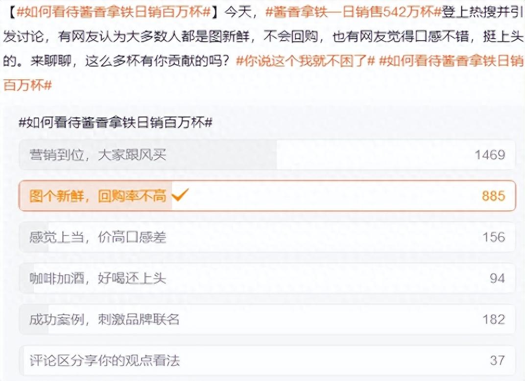 在微博一项“如何看待酱香拿铁日销百万杯”的投票中,共有2823人参与,1469人选择“营销到位,大家跟风买”,885人选择“图个新鲜,回购率不高”,只有94人选择“咖啡加酒,好喝还上头”。