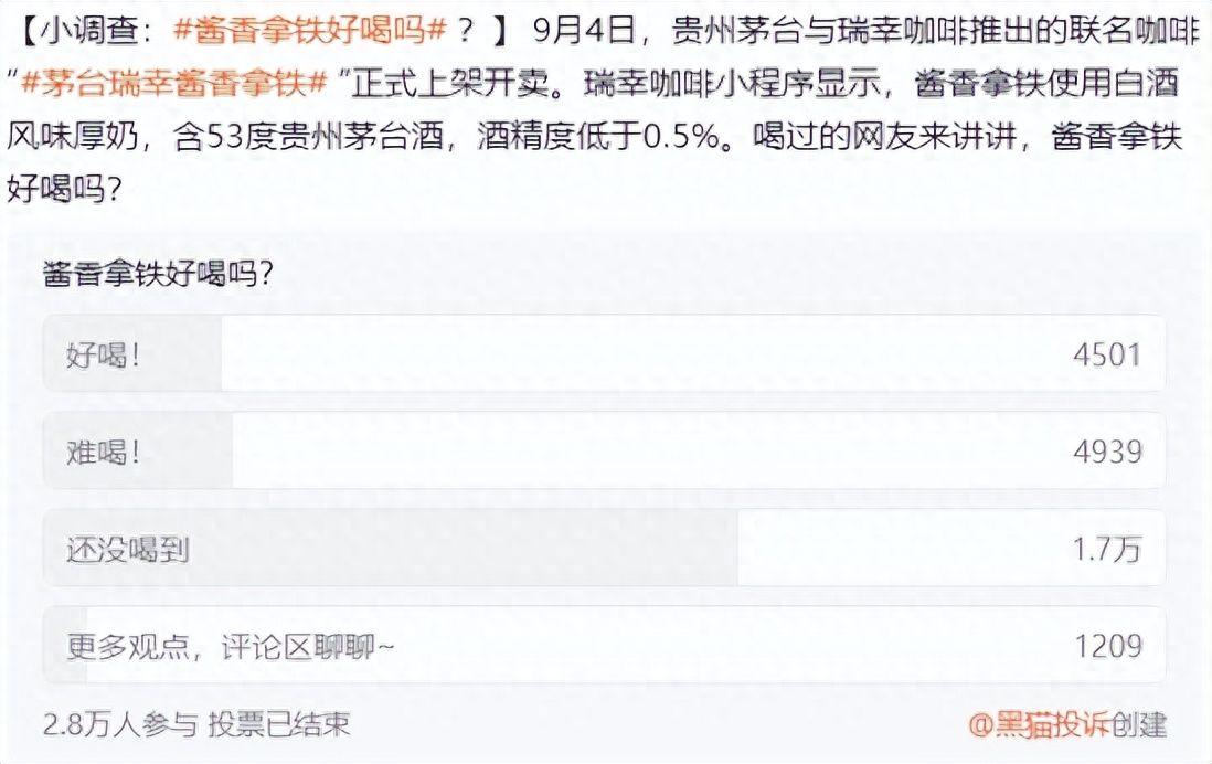 在一项2.8万人参与的“酱香拿铁好喝吗”的微博投票中,1.7万人表示还没喝到,而在喝过的网友中,4939人评价难喝,4501人评价好喝。