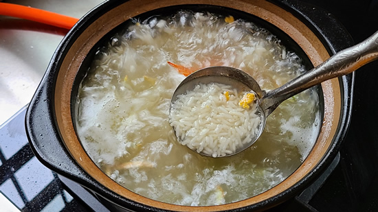 3.烧开之后,把腌制好的大米倒进去,用大勺子稍微搅拌一下,防止大米粘锅,接着盖上锅盖,开小火焖9-10分钟左右,中途要翻动2-3次左右,防止糊锅。时间到了之后,打开锅盖,把准备好的螃蟹块倒进去,稍微翻动一下,让螃蟹充分的没入粥里。(水最好要多放一点,不容易糊)