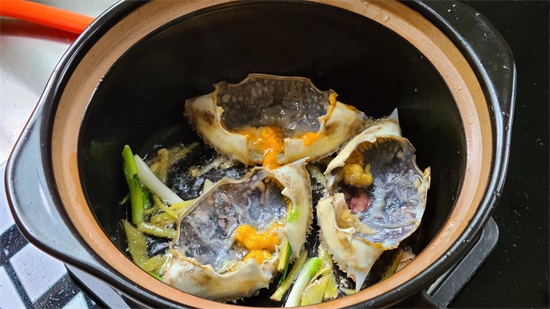 2.螃蟹清洗干净后再处理一下,从螃蟹后面把它的盖子打开,把螃蟹的腮、嘴全都去掉,接着把螃蟹切成4块放一边备用。取一个砂锅,放入生姜、葱白炒香,香味出来后,把螃蟹的盖子放进去煎一分钟,最后倒入适量的热水。