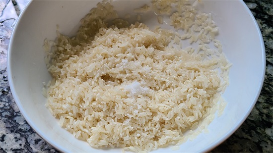 1.准备适量的大米,清洗干净后再腌制一下,大米里倒入2勺花生油、一勺盐,把它们全都搅拌均匀,腌制1个小时,也可以放入冰箱里面腌制。腌制过的大米会更加容易浓稠,不用煮那么长的时间。准备几只螃蟹,先把它用刷子洗干净。