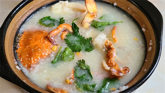4.放入螃蟹后,继续盖上锅盖,开小火焖4分钟左右,中途可以翻动一下。时间到了之后,打开锅盖再调一下味,放入 一点胡椒粉、小半勺盐,最后放上一点香菜,轻轻的翻动一下,就可以开吃了。放一点胡椒粉可以去腥还可以暖胃。这一道又简单又好吃的海鲜粥就算是做好了,放一点大虾进去,味道会更好哦。