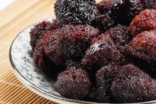 将杨梅倒入锅中,加入清水煮开后捞出,再倒入平底锅内,加入适量的细砂糖,中火将杨梅慢慢煮干,在这个过程中需要不断的翻动杨梅。待水分快要煮干的时候,加入少许柠檬汁,将杨梅煮至变干变小后,放入烤箱内烘烤80分钟即可。