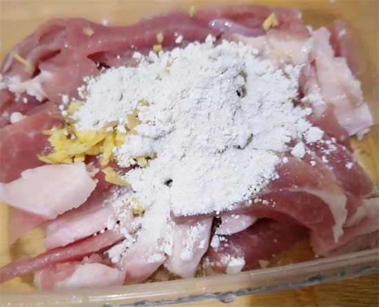 2.肥七瘦三的五花肉200克,将其切成厚片。肥的猪肉最好和瘦肉分开一些,这样容易煸炒出猪油,瘦肉也不会炒得太柴。猪肉里加生抽、酱油,生粉抓拌均匀腌制15分钟。